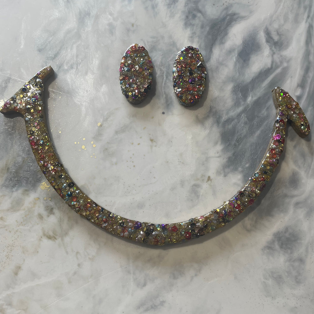 Bring a touch of sparkle and joy to your space with this playful smiley face design. The eyes and wide, upward curved smile are handcrafted from resin and embedded with glitter and sequins, catching the light beautifully from every angle. Each piece is unique, with a mix of vibrant colors that give it a fun, uplifting energy.