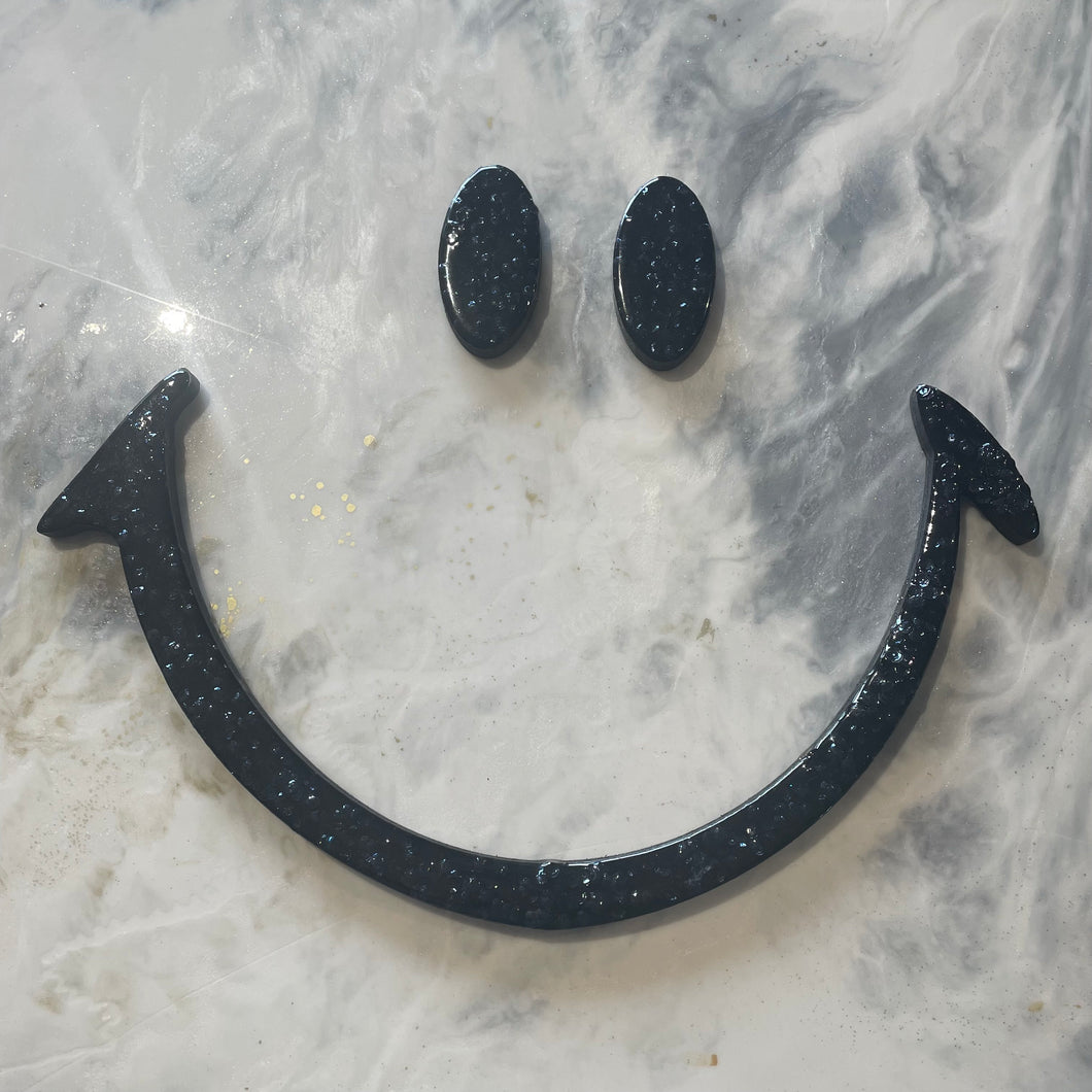 Bring a touch of sparkle and joy to your space with this playful smiley face design. The eyes and wide, upward curved smile are handcrafted from resin and embedded with glitter and sequins, catching the light beautifully from every angle. Each piece is unique, with a mix of vibrant colors that give it a fun, uplifting energy.