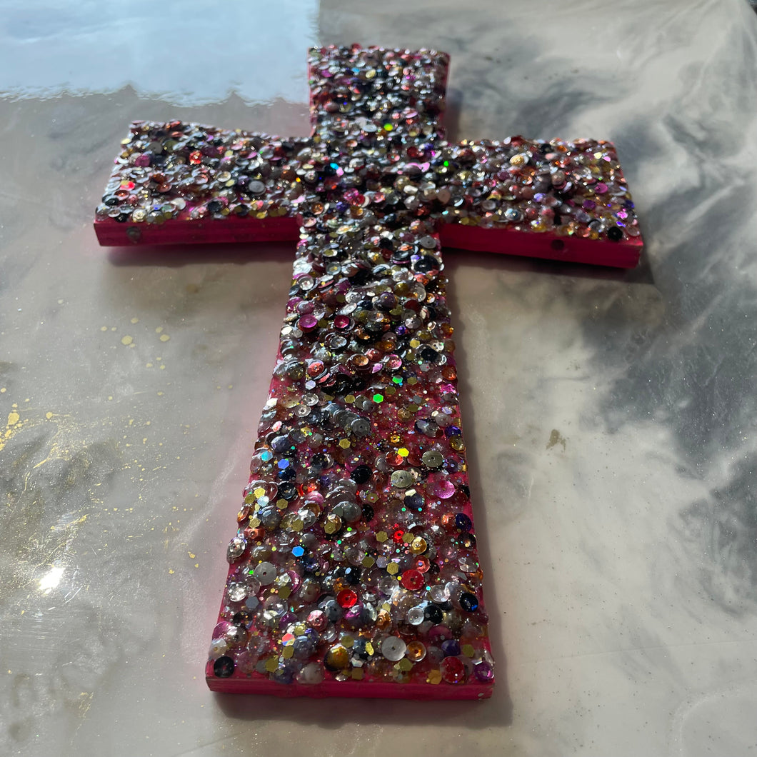 This striking cross is handcrafted on moisture resistant MDF and finished with layers of glitter, sequins, and high-gloss resin for a luminous effect. The sparkling surface catches the light beautifully, making it a unique statement piece for any room. Designed with a sturdy hook on the back, it’s lightweight and easy to hang perfect for adding colour, texture, and meaning to your wall décor.